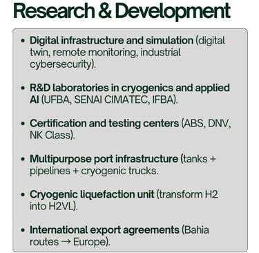 With the support of international experts, such as a chemical engineer, and solid partnerships in Brazil with the Bahia Technology Park (Unigel), the project emerges robust, innovative, and ready to transform Brazil into a global clean energy hub. We specialize in innovative solutions for the production and export of Green Hydrogen (Green H2) and Liquid Hydrogen (Green LH2) to meet the growing global demand for clean, low-carbon energy